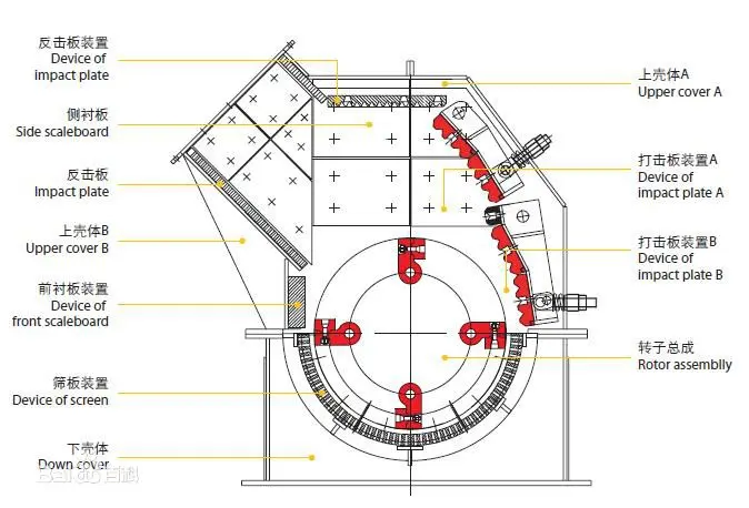 संरचना सरल छ र एक क्यानिंग, एक रोटर र प्रभाव प्लेट प्लेट। प्रभाव क्रशरको मुख्य कार्यरत भाग एक प्लेट हतौडाको साथ एक उच्च-गति घुमाउने रोटर हो। पारस्परिक प्रभाव प्रक्रियाको क्रममा, भौतिक ब्लक पनि एक अर्कासँग टकराउँदछ। यो सामग्री प्लेट हतारले हिट भएको छ, यसले प्रभाव प्लेट र एक अर्काको बीचमा टकराव, क्र्याक्स र छोडेको बिचमा उत्पन्न भएको छ, जुन अन्ततः कुटपिट गर्न जान्छ। प्रभाव उपकरण प्लेट हतार द्वारा हिट को प्रतिरोध गर्न को लागी प्रयोग गरीन्छ र यसलाई रिबाउँदछ। मुख्य घटकले प्रभाव प्लेट हो, जुन स्टील प्लेटहरूको साथ वेँडियो। यसको यसको प्रभाव सतहमा लगाम प्रतिरूप्लारीहरू छन्, र केहि प्रभाव बारहरू वा ग्रेटिंग प्लेटहरू प्रयोग गर्छन्।